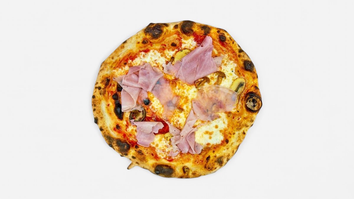 Pizza mit Tomatensoße, Fior di Latte (ital. Mozzarella), Prosciutto Cotto (ital. Kochschinken) und Champignons