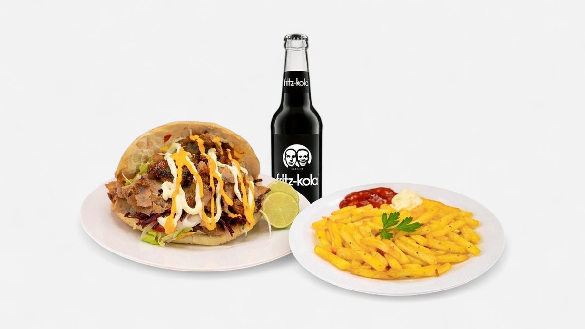 Besteht aus Döner Kebap (classic), Pommes und Softdrink