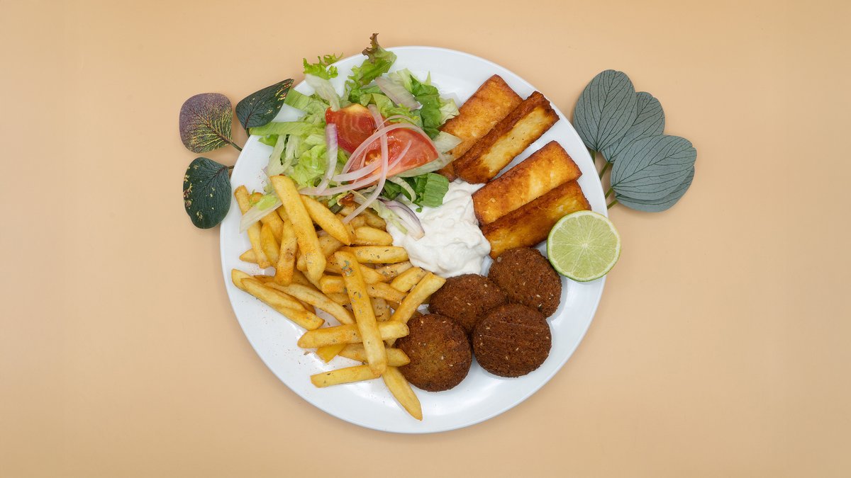 mit knusprigen Falafeln, gebratenem Halloumi, frischem Salat, Pommes und cremiger Tahini-Soße