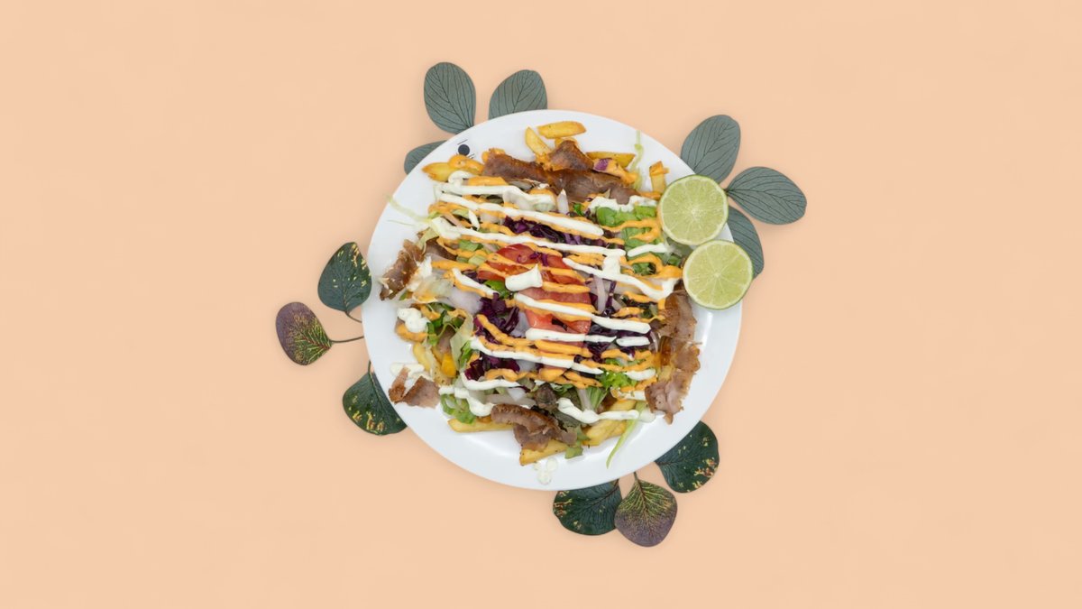 mit einer Schicht knuspriger Pommes, saftigem Dönerfleisch, frischem Salat und Soße, Ketchup oder Mayonnaise nach Wahl