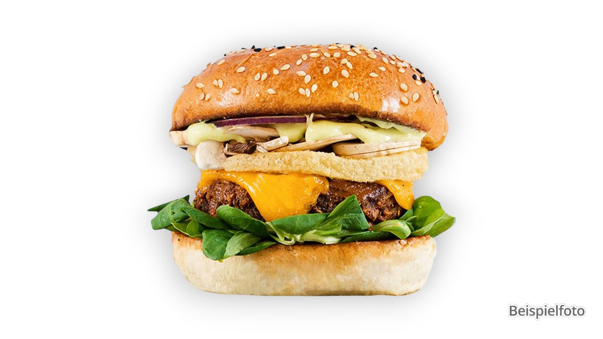 alle Burger werden mit mit Tomaten, Zwiebeln, Blattsalat, Gewürzgurken und Soße im Burgerbrötchen zubereitet