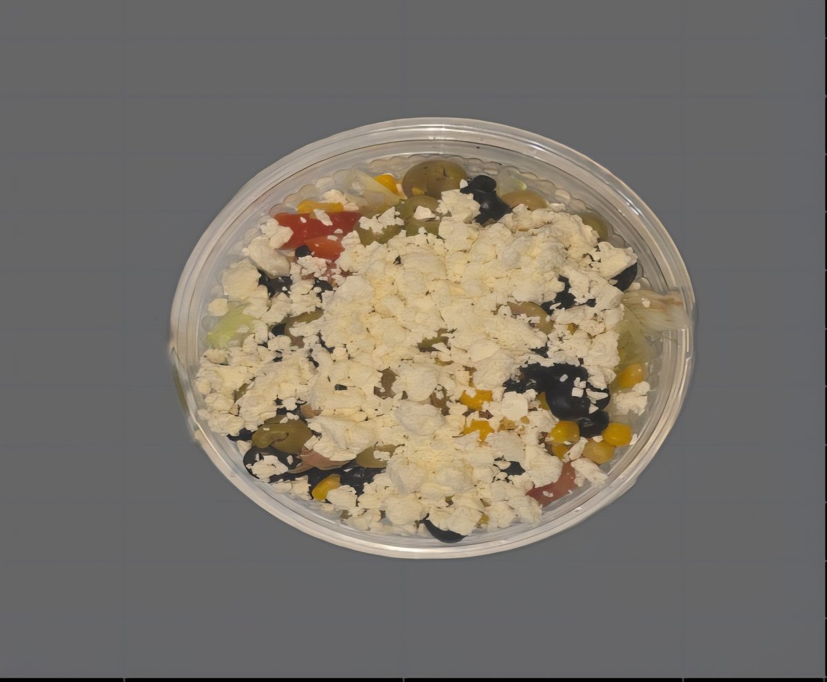 mit Eisbergsalat, Tomaten, Gewürzgurken, Mais, Oliven, Hirtenkäse und hausgemachtem Dressing