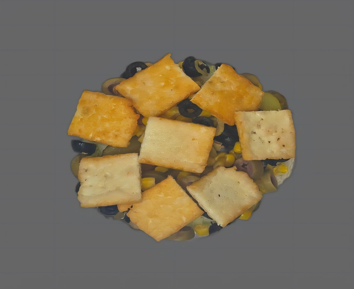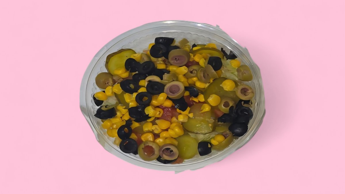 mit Eisbergsalat, Tomaten, Gewürzgurken, Mais, Oliven und hausgemachtem Dressing