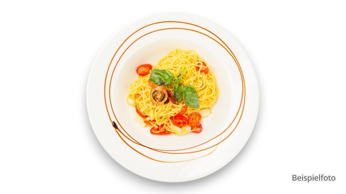 scharf Bandnudeln mit Rinderfleischspitzen, Zwiebeln, Kirschtomaten und Knoblauch in Tomatensoße