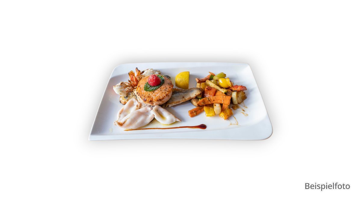 mit gegrilltem Lachs, Tintenfisch und Scampi in Hummersoße, dazu Reis