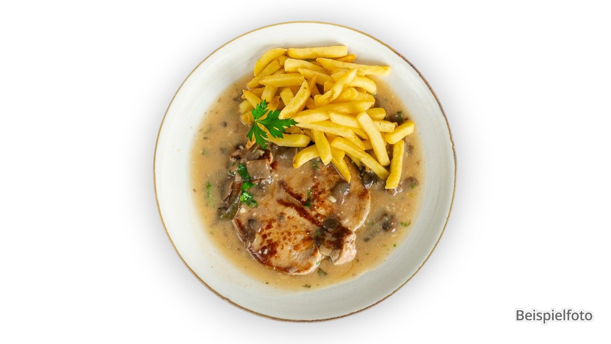 mit Schinken vom Schwein und Käse in Pfeffer-Sahnesoße, dazu Pommes frites