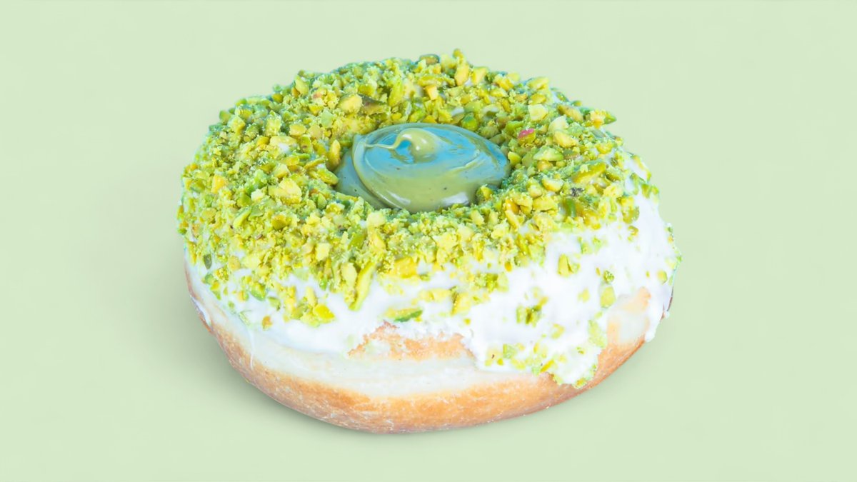 Eine Glasur aus weißer Schokolade, gefüllt mit Pistazien-Creme und mit Pistazien Stückchen verziert.