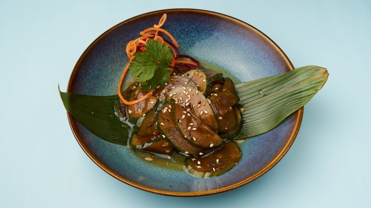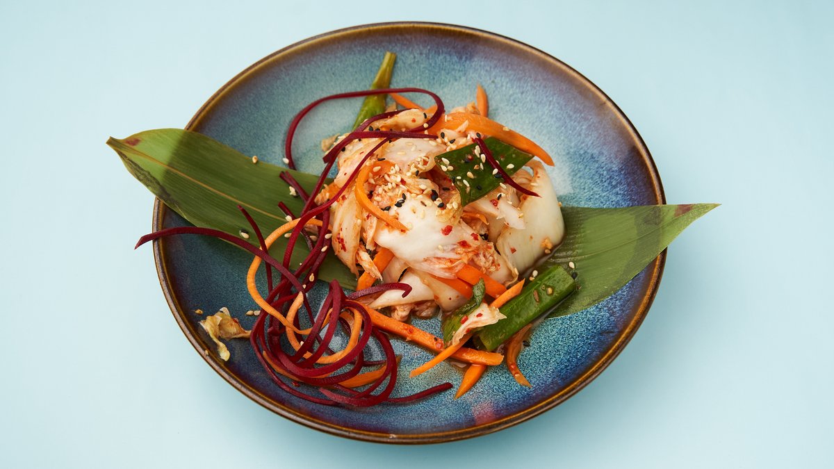 mit leicht-knuspriger Barbecuesoße, hausgemachtem Kimchi, eingelegtem Wurzelgemüse und Limetten-Knoblauchsoße