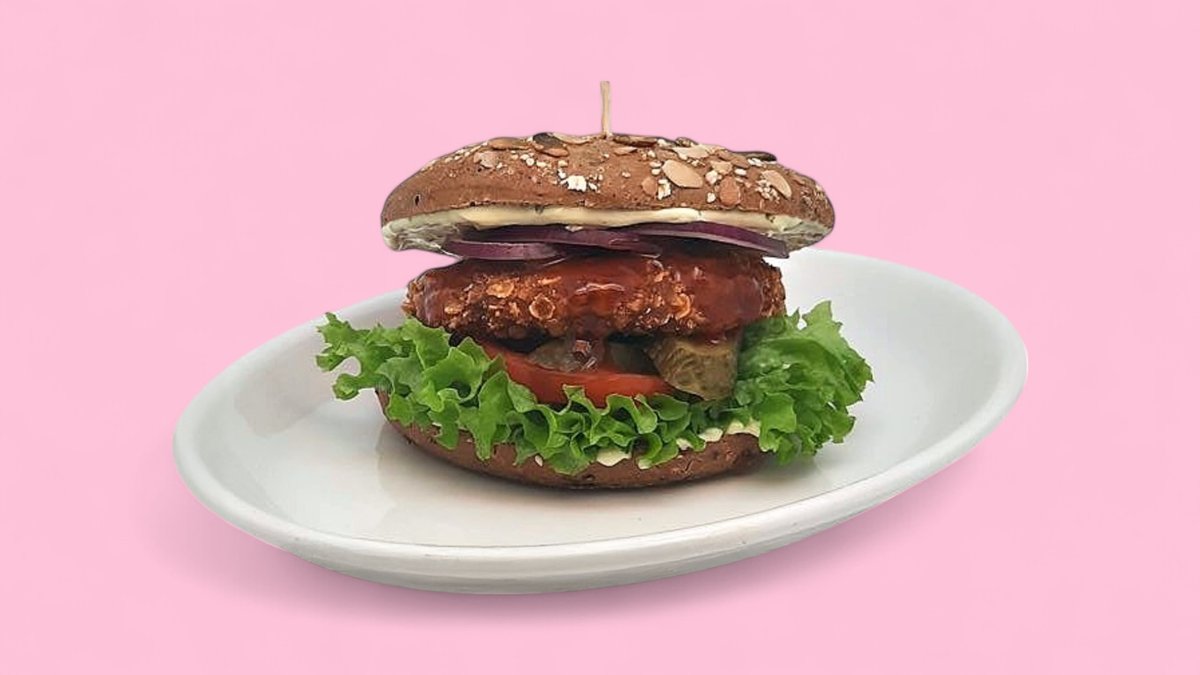 vegane KĂĽrbissemmel, Crunchy Chicken Style Bratling, Salat, Tomate, Essiggurke, Agave-Chili-SoĂźe, rote Zwiebeln und Effe's-BurgersoĂźe