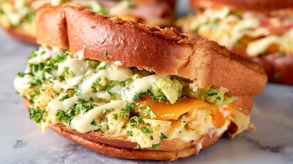 unsere großen Eggdrop Sandwiches werden mit gebuttertem Brioche, Egg Patty, Secret Sauce und Cheddar Cheese zubereitet