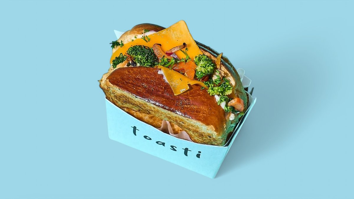 Toast zubereitet mit getoastetem Briochebrot, Pesto, Sour Cream, gegrillten Champignons, Paprika, Brokkoli, Zwiebeln und Cheddar