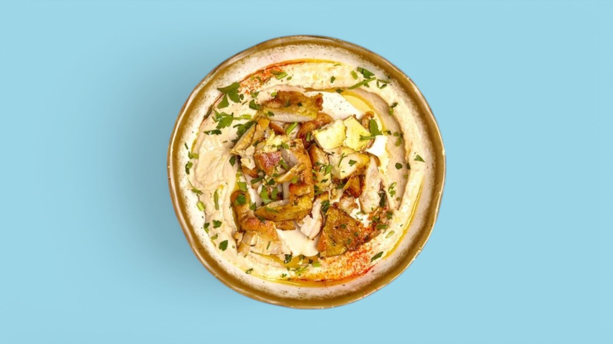 Hausgemachtes Hummus, mit gegrillten Hühnerbrust streifen, Kichererbsen, Gewürzen, Olivenöl, Petersilie, Sesamsoße und Toast