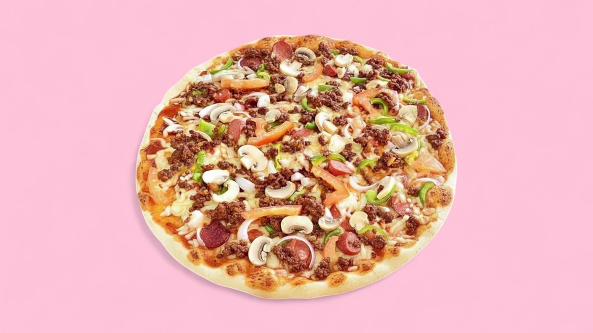 Diese Pizza ist reichlich belegt mit Hackfleisch,Champignons bunten Paprikaschoten, zwiblen, und kräftigen Scheiben scharfer Jalapeños.salsa roja, Guacamole.