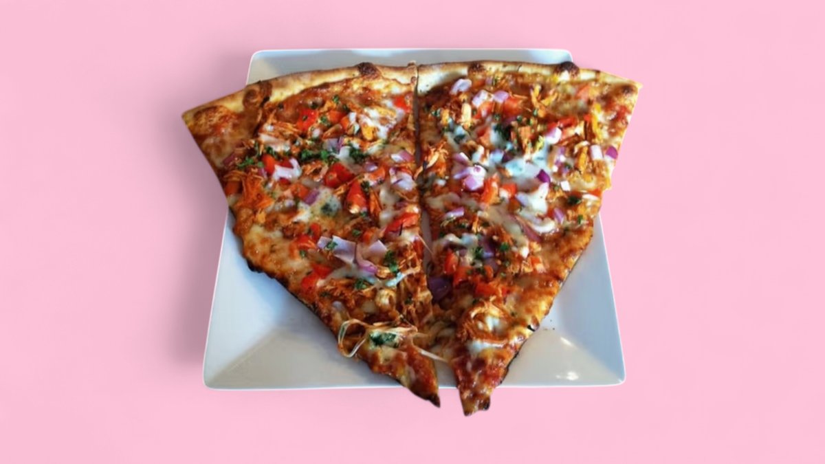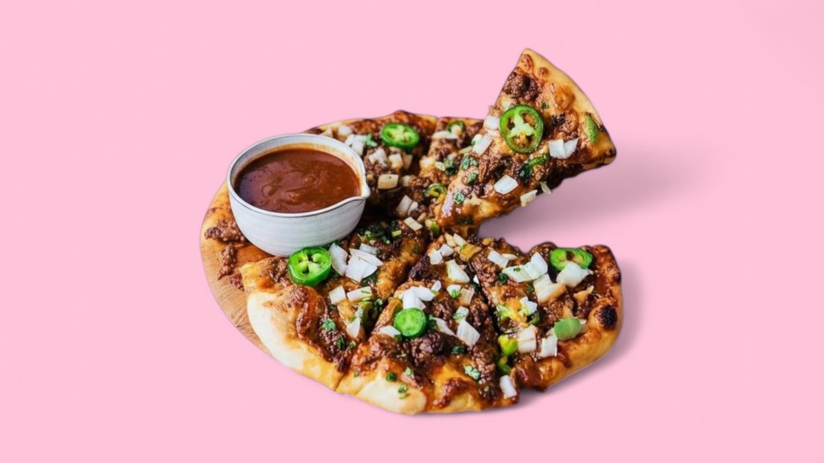 Diese Pizza ist reichlich belegt mit Tinga-Hähnchen, saftigen Tomaten, pico de gallo,Mais, schwarzen Oliven und kräftigen Scheiben scharfer Jalapeños.Saurcream,Guacamole.