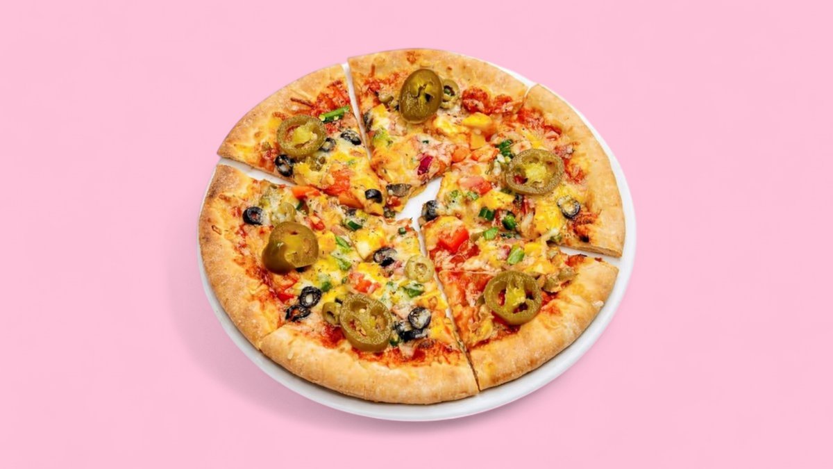 Diese Pizza ist reichlich belegt mit bunten Paprikaschoten, saftigen Tomaten, Mais, pico de gallo,schwarzen Oliven und kräftigen Scheiben scharfer Jalapeños. Saurcream,Guacamole.