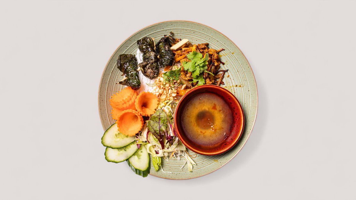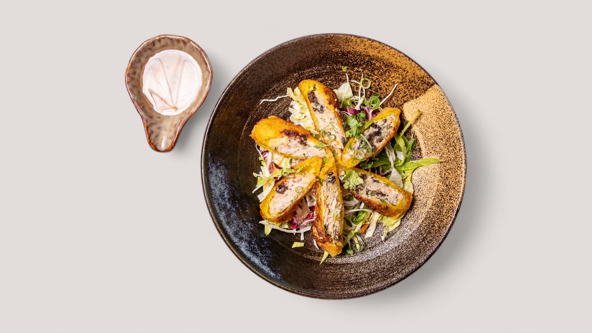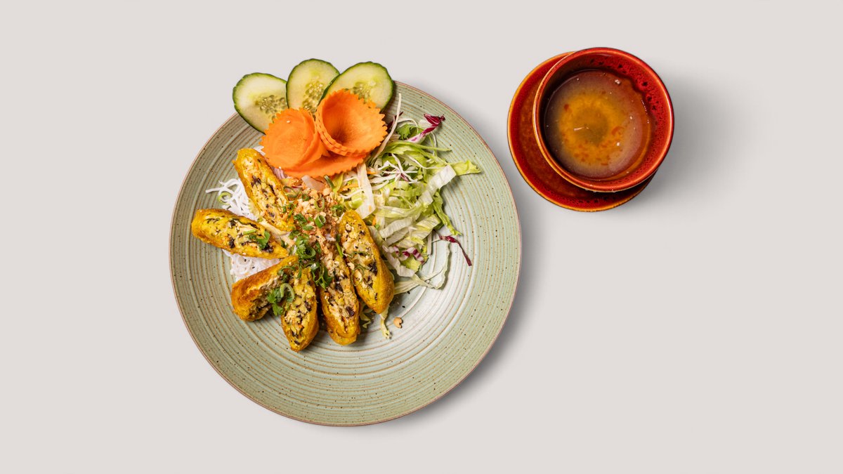 2 Stück frische Reispapierrollen mit Reisnudeln, Mix-Salat, Gurken, Koriander, dazu Hoisin-Erdnuss-Dip und Zutat nach Wahl