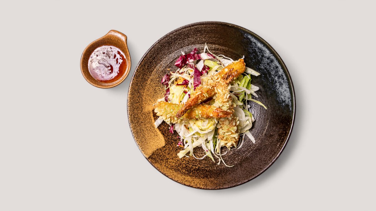 3 Stück frittierte Garnelen umwickelt mit Klebreisflocken, dazu Süß-Sauer-Soße