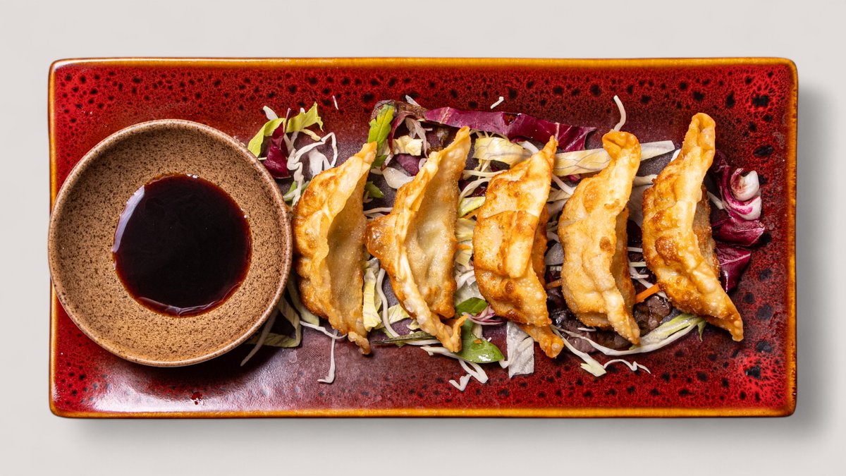 5 Stück gebackene Teigtaschen gefüllt mit Hähnchenfleisch, gehackten Garnelen, Karotten, Morcheln und Zwiebeln, dazu Süß-Sauer-Soße