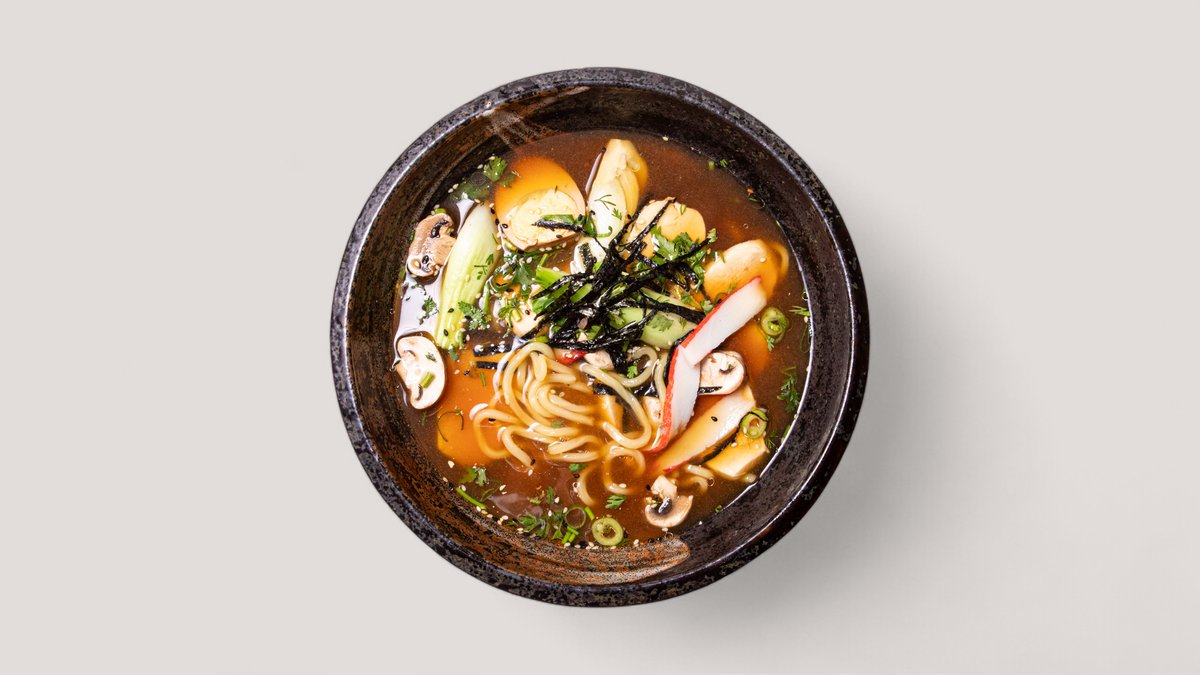 japanische Nudelsuppe mit einem halben Ei, Champignons, Pak Choi, Paprikapulver, Miso und Sojasoße