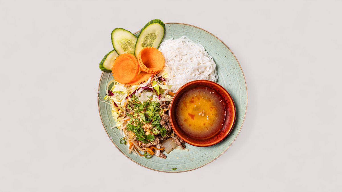 scharf dicke Reisnudeln in würziger Hue Suppe mit Rindfleisch, hausgemachter vietnamesischer Wurst und frischen Kräutern