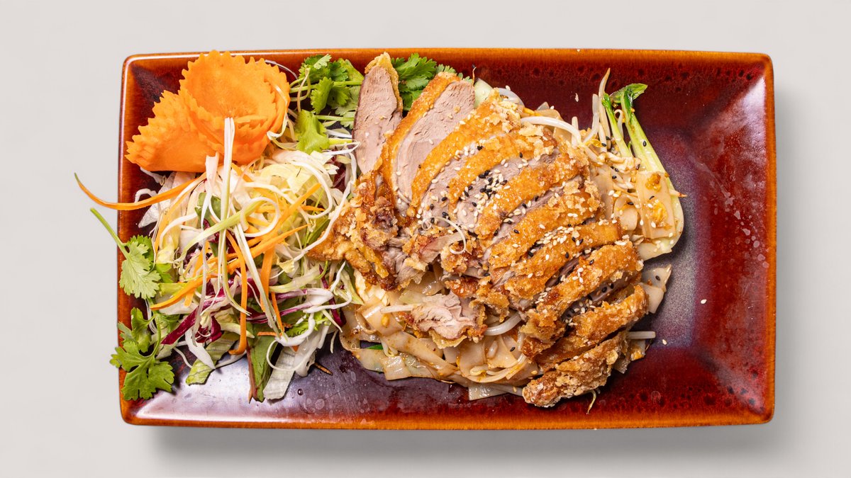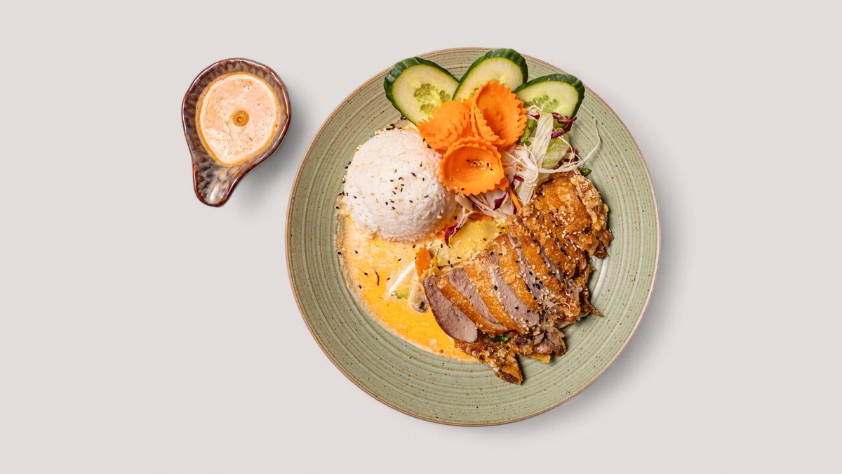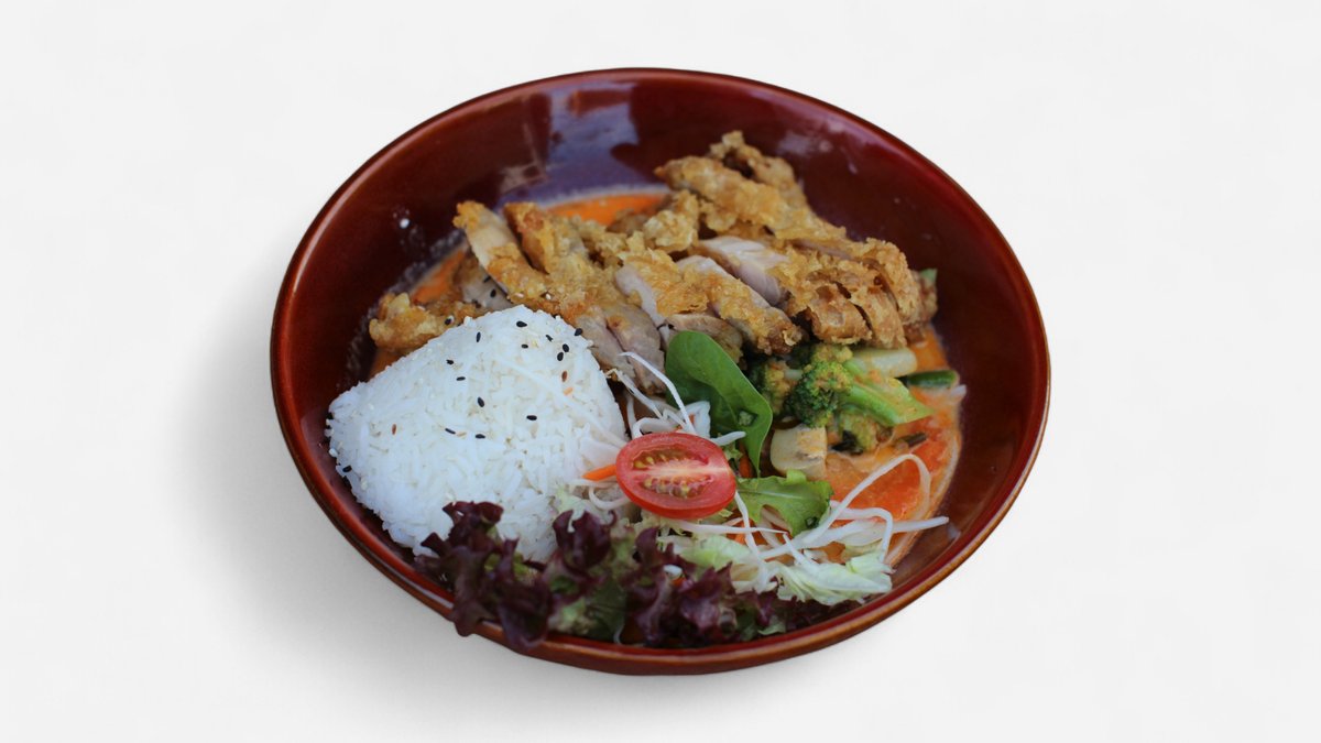 gebratenes Hühnerkeulenviertel mit Jasminreis, dazu frischer Salat, geröstete Zwiebeln und Erdnüsse, serviert in einer roten Curry Soße