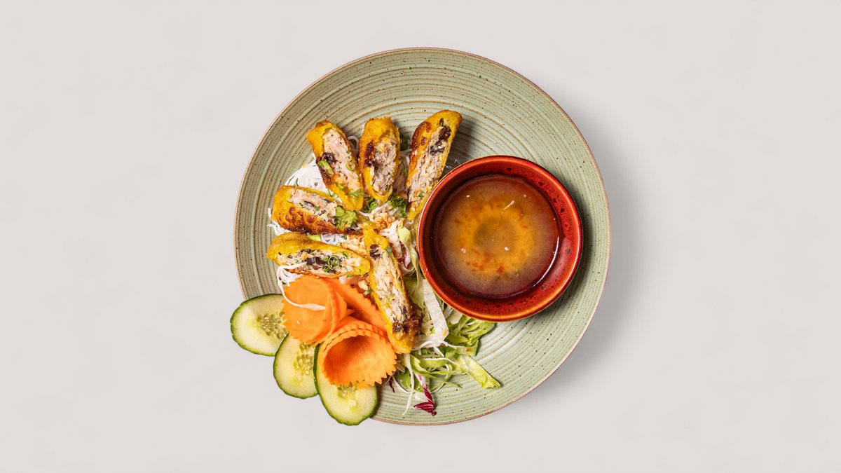 3 Stück frittierte hausgemachte Frühlingsrollen mit Schweinefleisch, dazu vietnamesische Soße