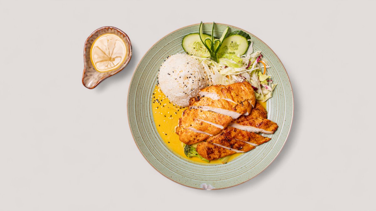 mit cremiger Mango-Kokossoße, Gemüse, Jasminreis und Zutat nach Wahl