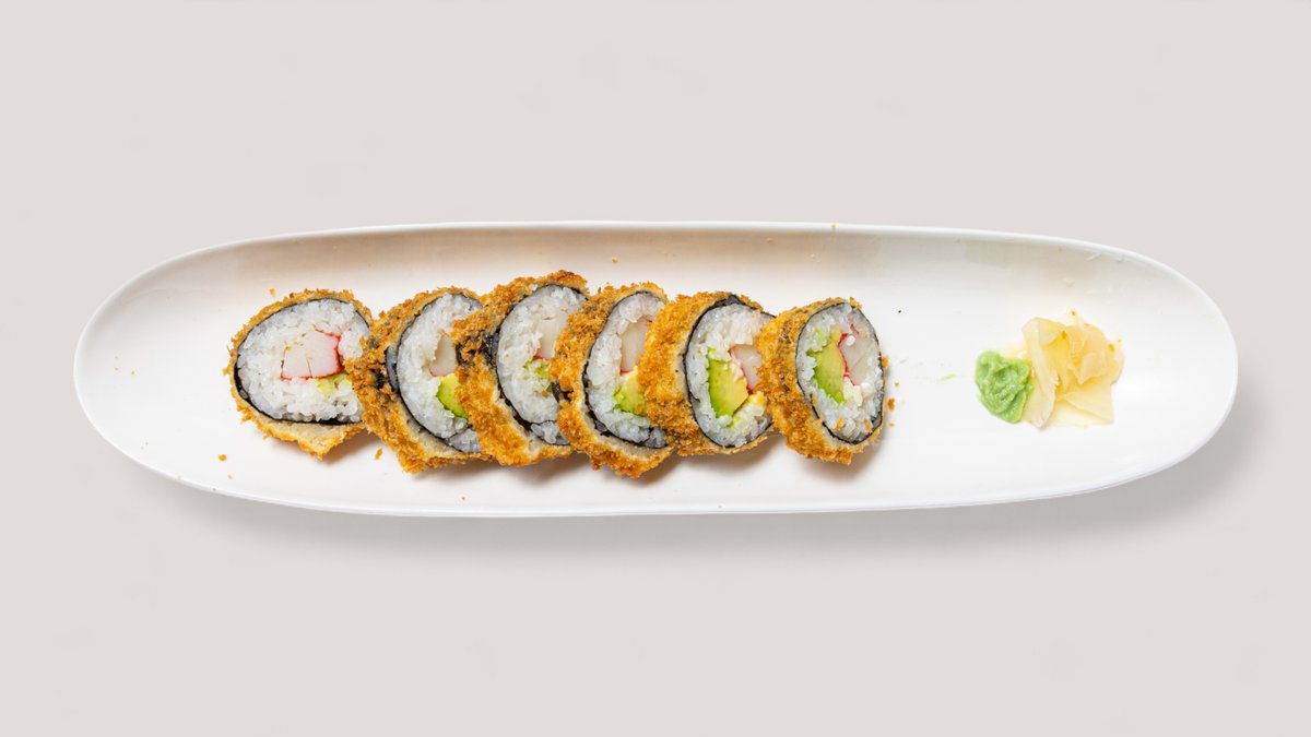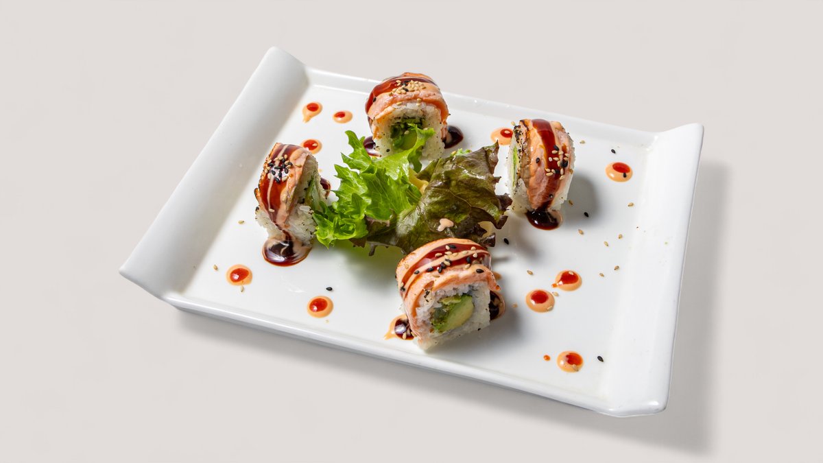 4 Stück mit Lachs im Tempura-Mantel, Avocado, Frischkäse und Feuerlachs