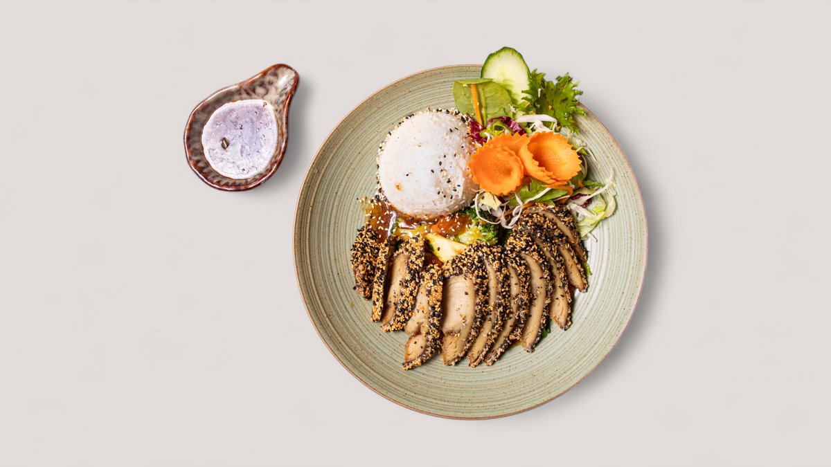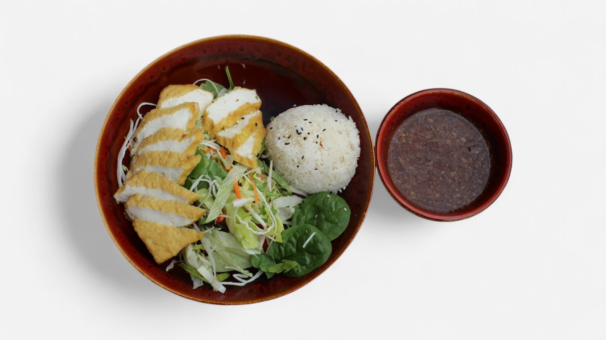gegrillter Tofu mit Jasminreis, dazu frischer Salat, geröstete Zwiebeln und Erdnüsse, serviert in einer hausgemachten Teriyaki Soße