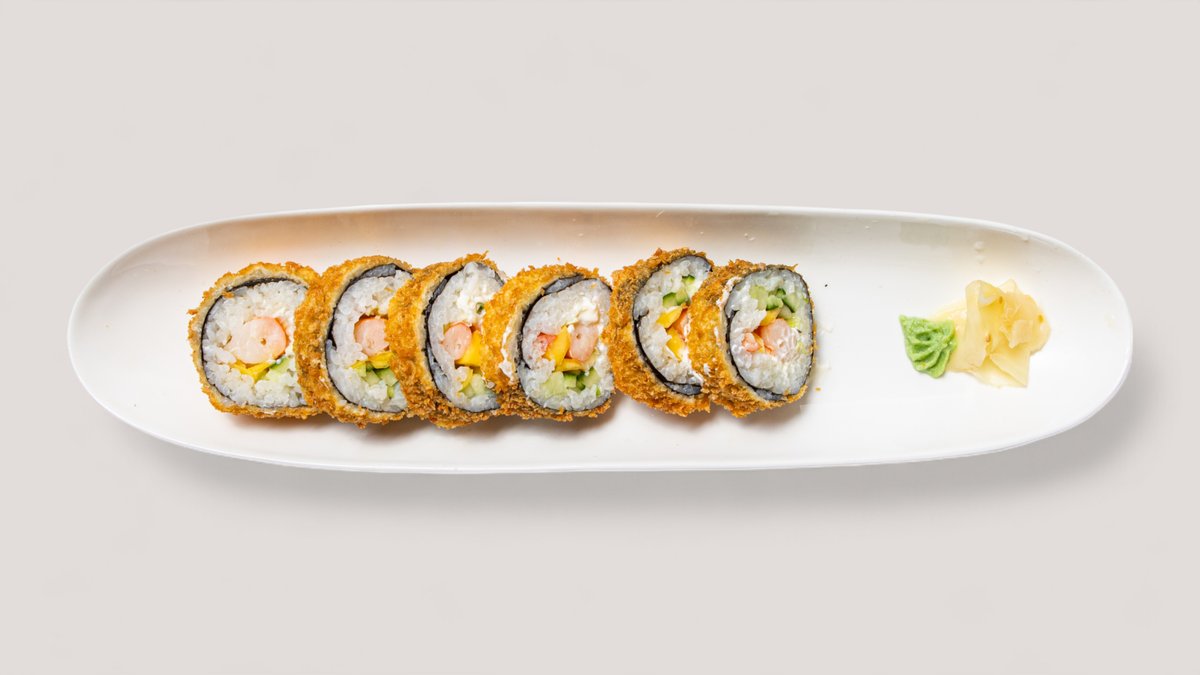 4 Stück mit Tempura Garnelen, Mango, Avocado, Philadelphia und Feuerlachs