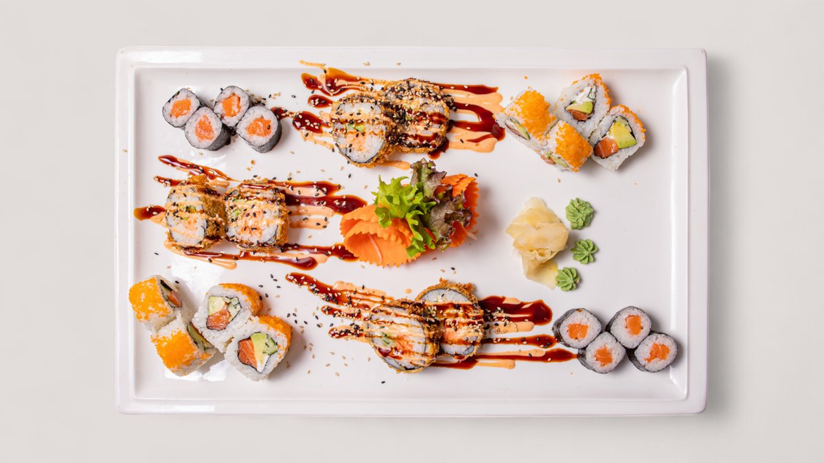 6x Crab Meat Maki 6x Sake-Avocado Maki 4x Nigiri 4x Sashimi 8x California Inside-Out Rolls 5x Salmon Rolls 2x Spicy Salmon Nigiri