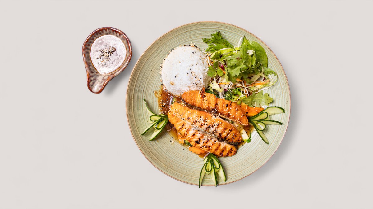 mit hausgemachter Teriyaki-Soße, Gemüse, Jasminreis und Zutat nach Wahl