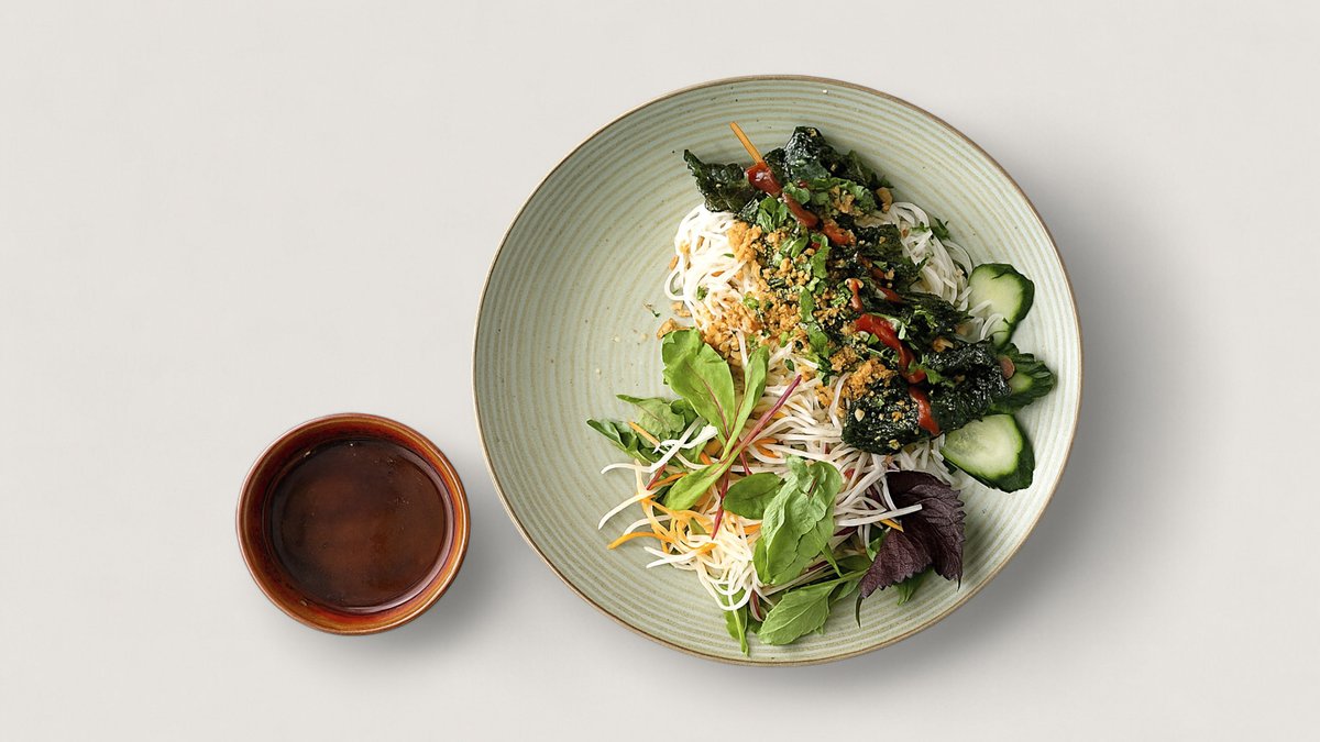 Glasnudelsalat mit frischen vietnamesischen Kräutern, Kirschtomaten, Erdnüssen, Sesam und Koriander, dazu hausgemachte Soße