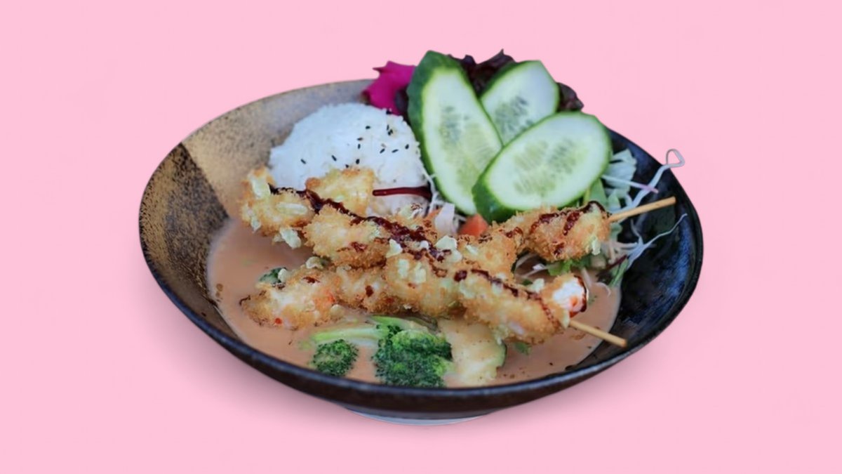 frittierte vegane Garnelen mit Jasminreis, dazu frischer Salat, geröstete Zwiebeln und Erdnüsse, serviert in einer hausgemachten Erdnuss Kokosmilch Soße