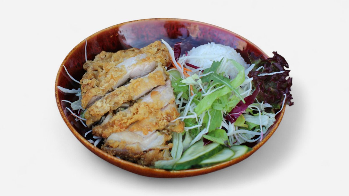 gebratenes Hühnerkeulenviertel mit Jasminreis, dazu frischer Salat, geröstete Zwiebeln und Erdnüsse, serviert in einer hausemachten Teriyaki Soße