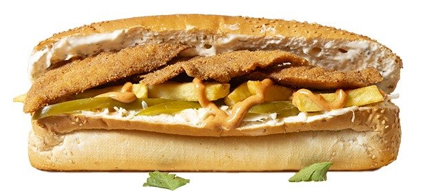 scharf belegtes weiches Baguette mit scharfer Soße, Cocktailsoße, eingelegten Gurken und 2x knusprigen Filets