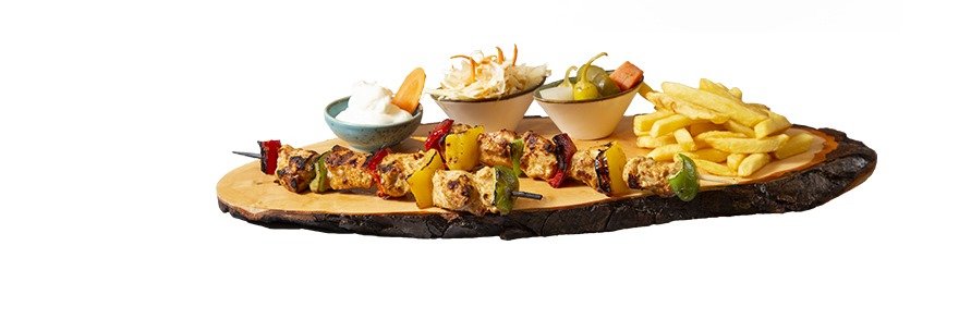 2 gegrillte Hähnchenspieße mit Pommes frites, Knoblauchcreme und eingelegtem Gemüse, scharfem Dip und Krautsalat