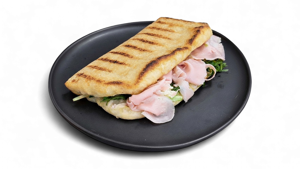 A flame-grilled gluten-free sandwich layered with silky stracciatella, juicy cherry tomatoes, and fresh mixed salad, delivering the perfect creamy, fresh bite.