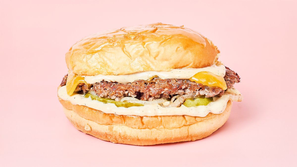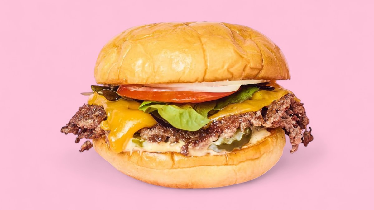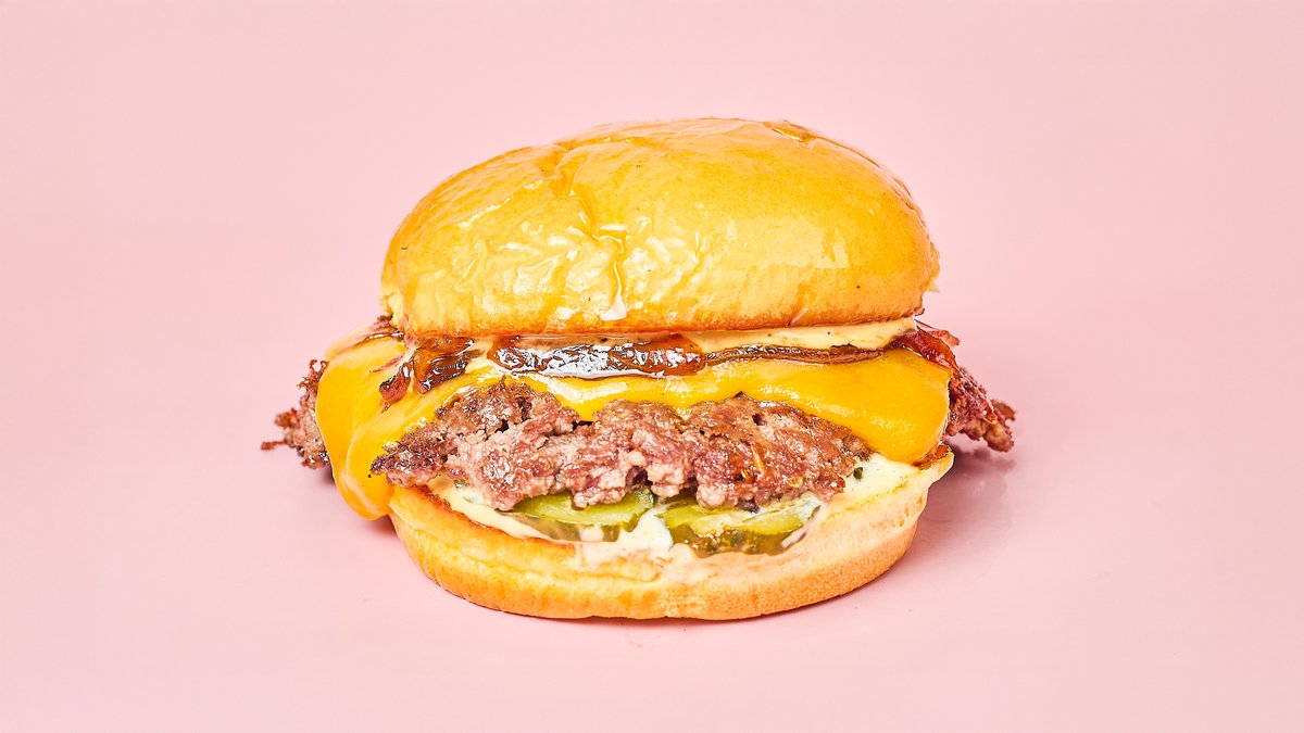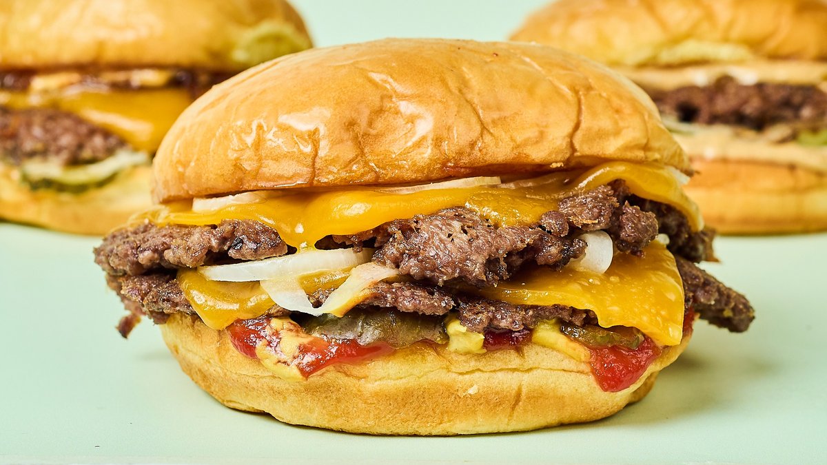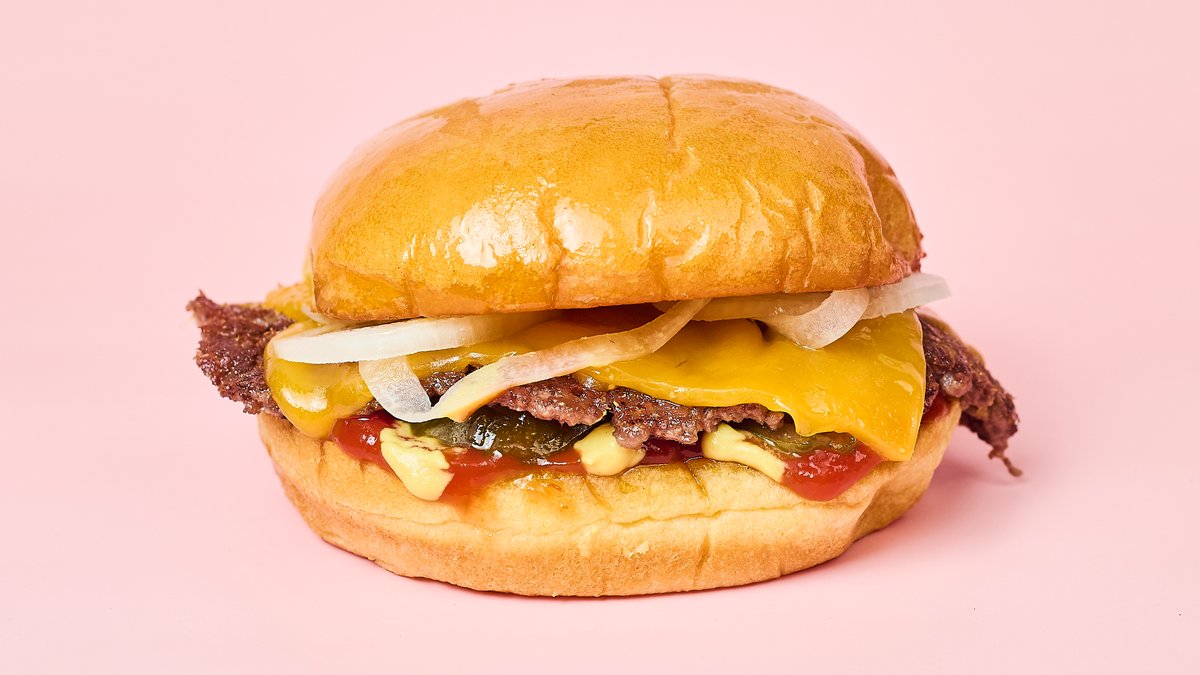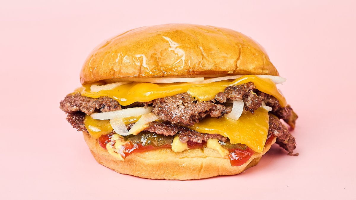 mit 2x Rindfleisch-Patties, geschmolzenem Cheddar und frischen roten Zwiebeln