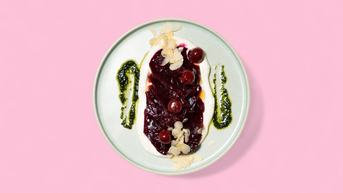 Sauerkirschen und rote Bete serviert auf einer Creme aus Frischkäse , Kaymak (türkischer Stracciatella) & Lime- getoppt mit Mandeln und Petersilie - Dill - Minz Sauce