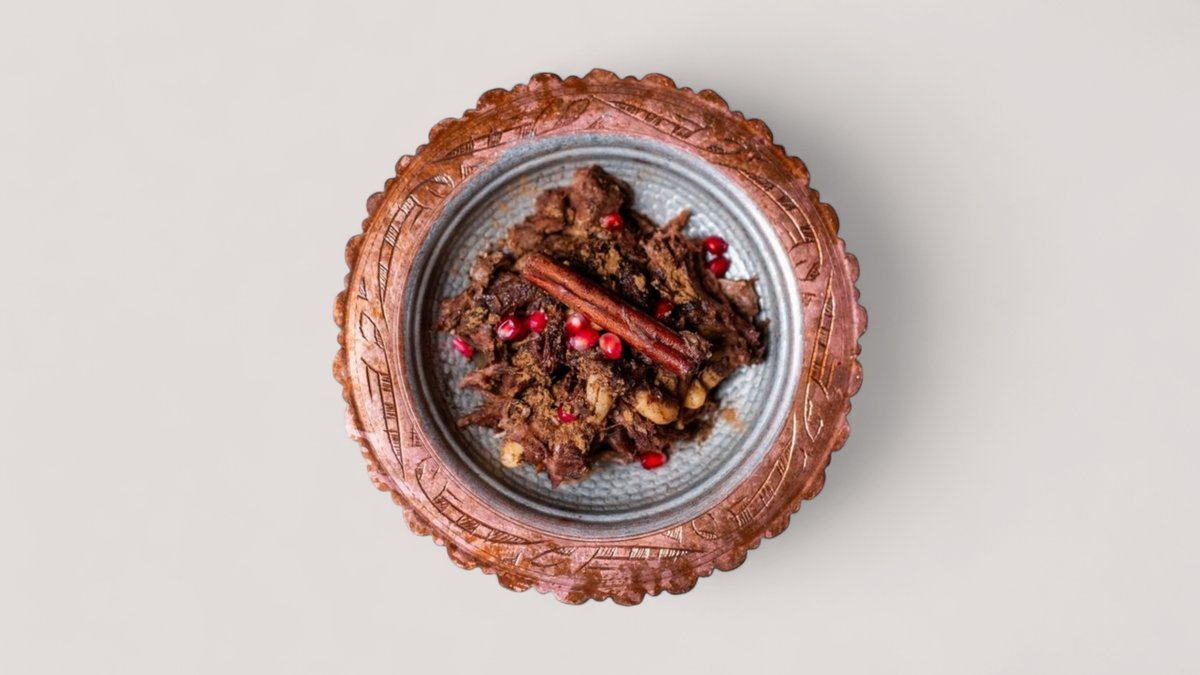 zart und süß geschmorter Lammhals mit Zimt, getrockneten Pflaumen, Aprikosen und gerösteten Mandeln