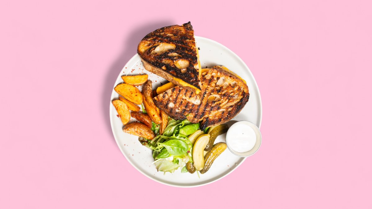 Sauerteigbrot von Albatross (mit Butter und Mayo goldbraun gegrillt) serviert mit Kartoffelecken, türkischen Cornichons und Frischkäse