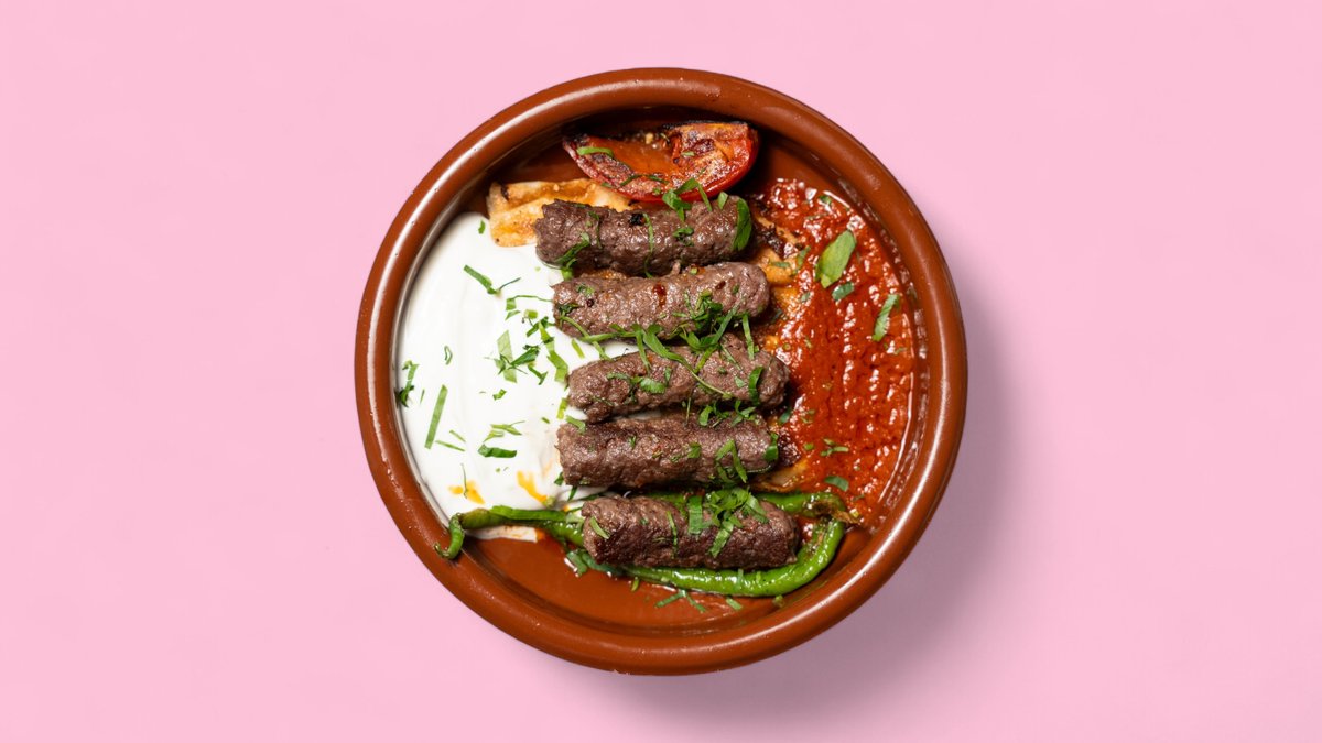 zarte Köfte-Spieße aus Lamm & Rind auf gegrilltem „Sütlü Pide“ , verfeinert mit einer aromatischen Tomatensauce und einem cremigen Joghurt , abgerundet mit gebratener Butter.