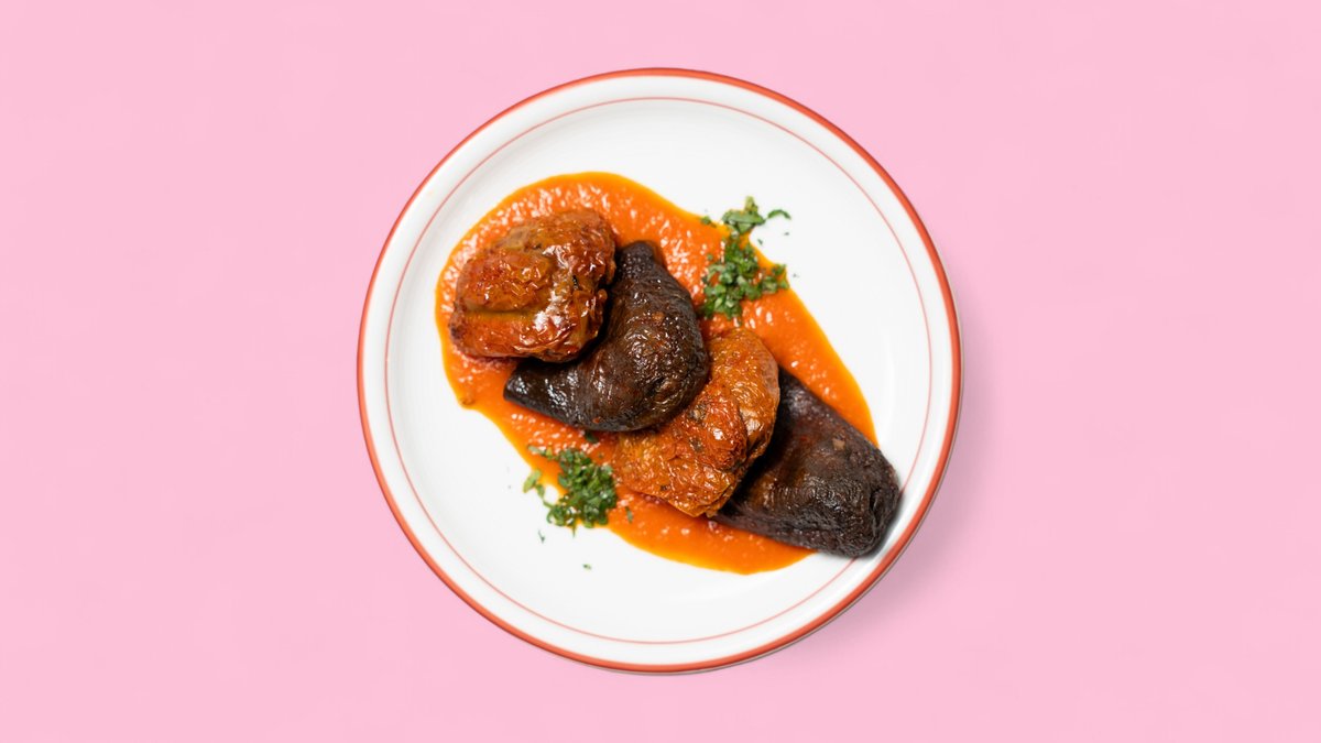 sonnengegtrocknete grüne Paprika und Auberginen, gefüllt mit aromatischem Reis, Kräutern und Gewürzen