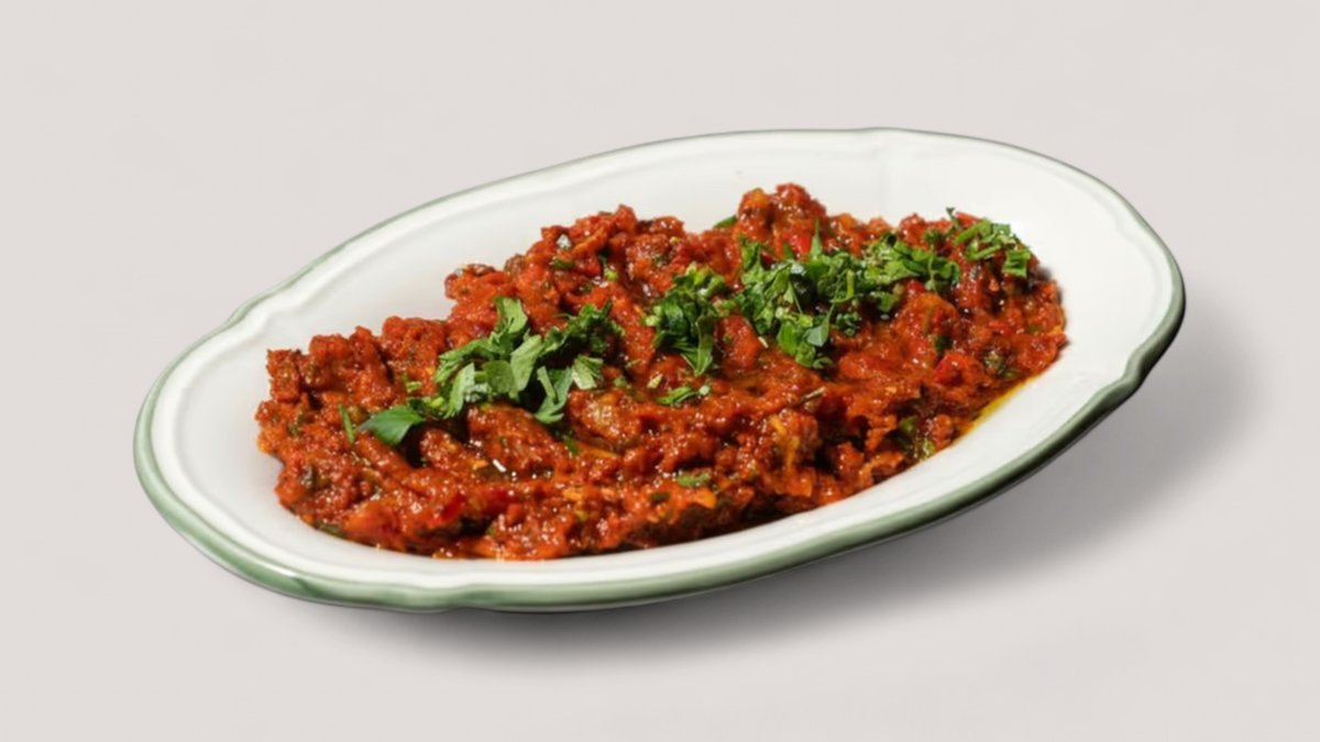 feurig-würzige Tomaten-Paprika-Paste, fein gehackt, mit Kräutern, Walnüssen, Zwiebeln und Olivenöl verfeinert