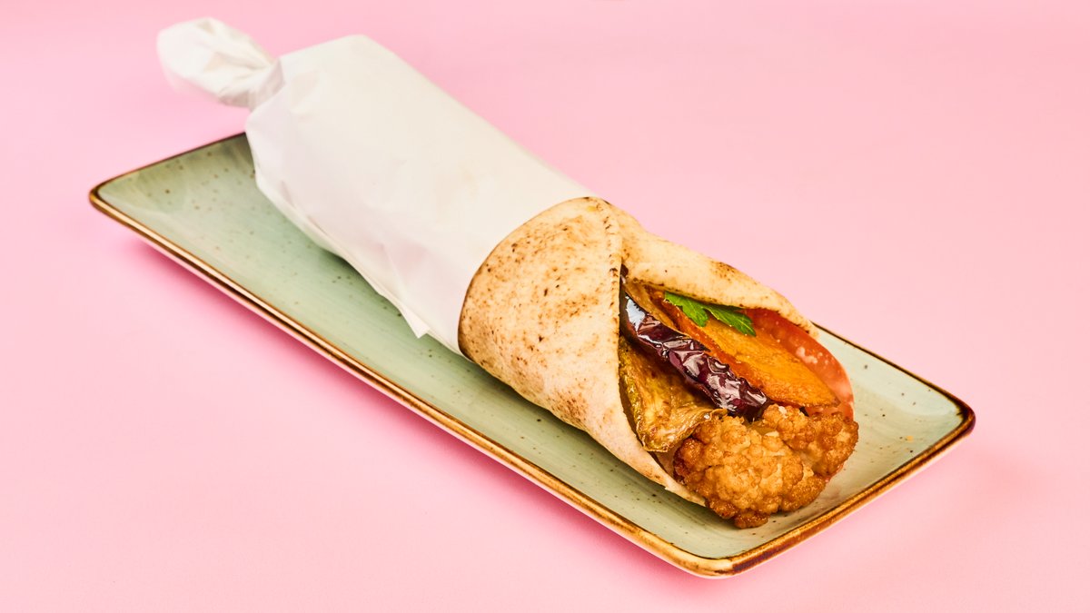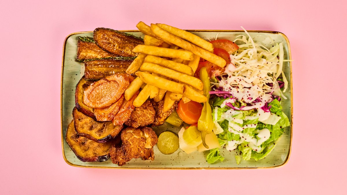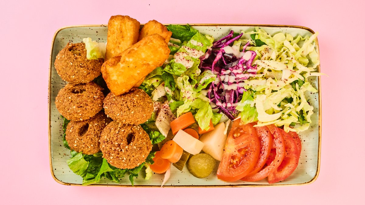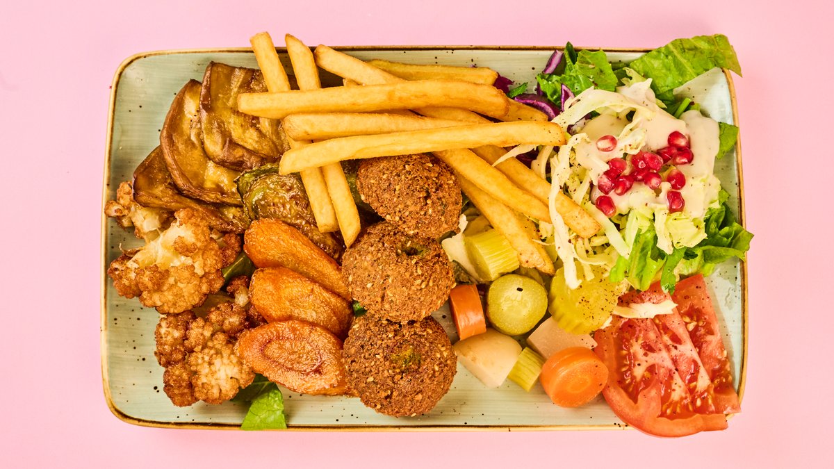 mit Falafel, Auberginen, Zucchini, Blumenkohl, Karotten, Kartoffeln, Tomaten, Salat, Petersilie, Minze, Kohl, eingelegten Gurken, Rübe und Tahini