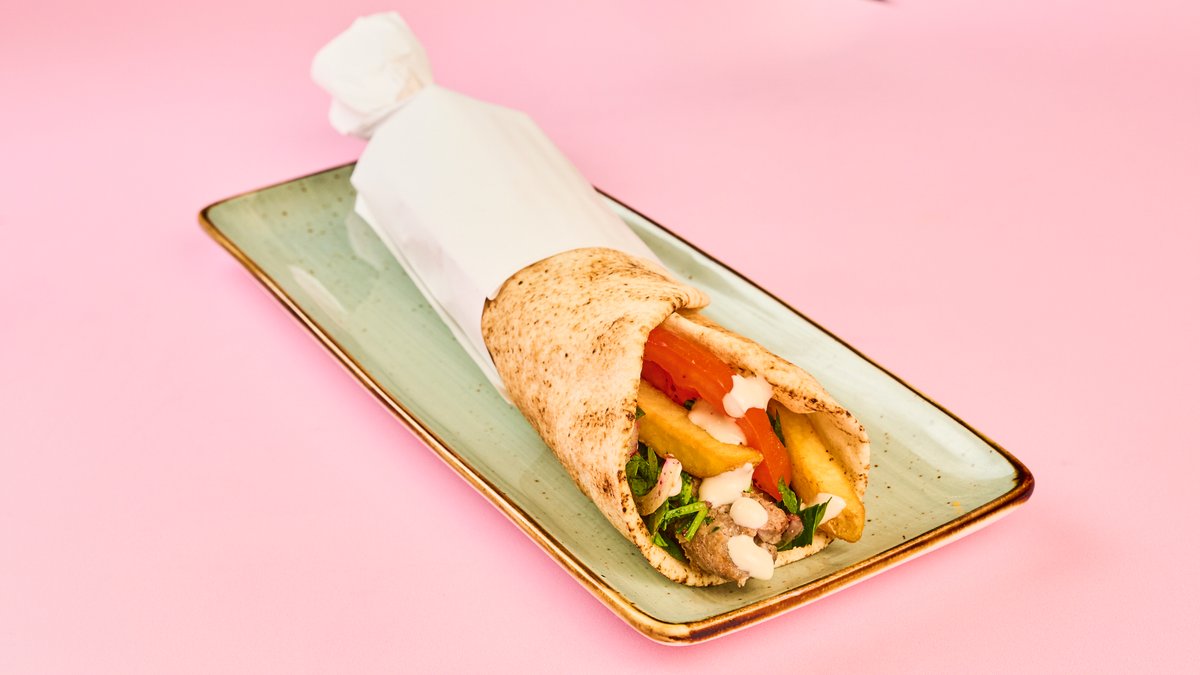 mit Rinderhackfleisch, Salat, Hummus und einer Beilage deiner Wahl