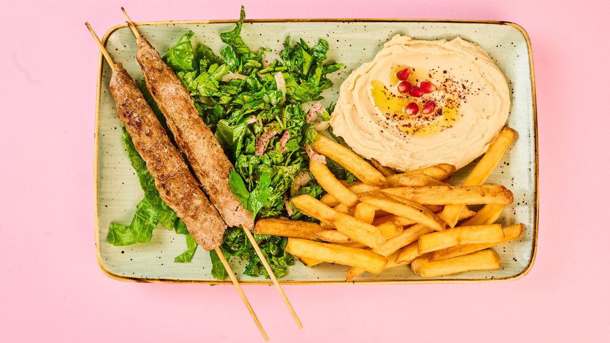 mit Rinderhackfleisch, Zwiebeln, Sumak, Hummus, Pommes frites und Salat