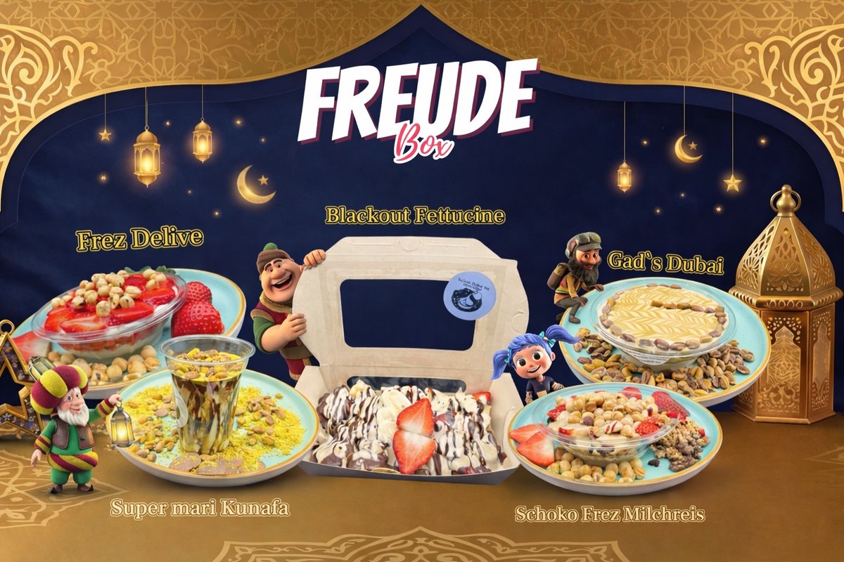 1x Frez Delive, 1x Kunafa super Mari, 1x Schoko Frez Milchreis, 1x Gad‘s Dubai, 1x Blackout Fettuccine.