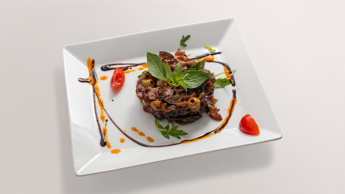 mit gebackenen Auberginen, Oliven, Sellerie und Kapern in süßsaurer Tomatensoße